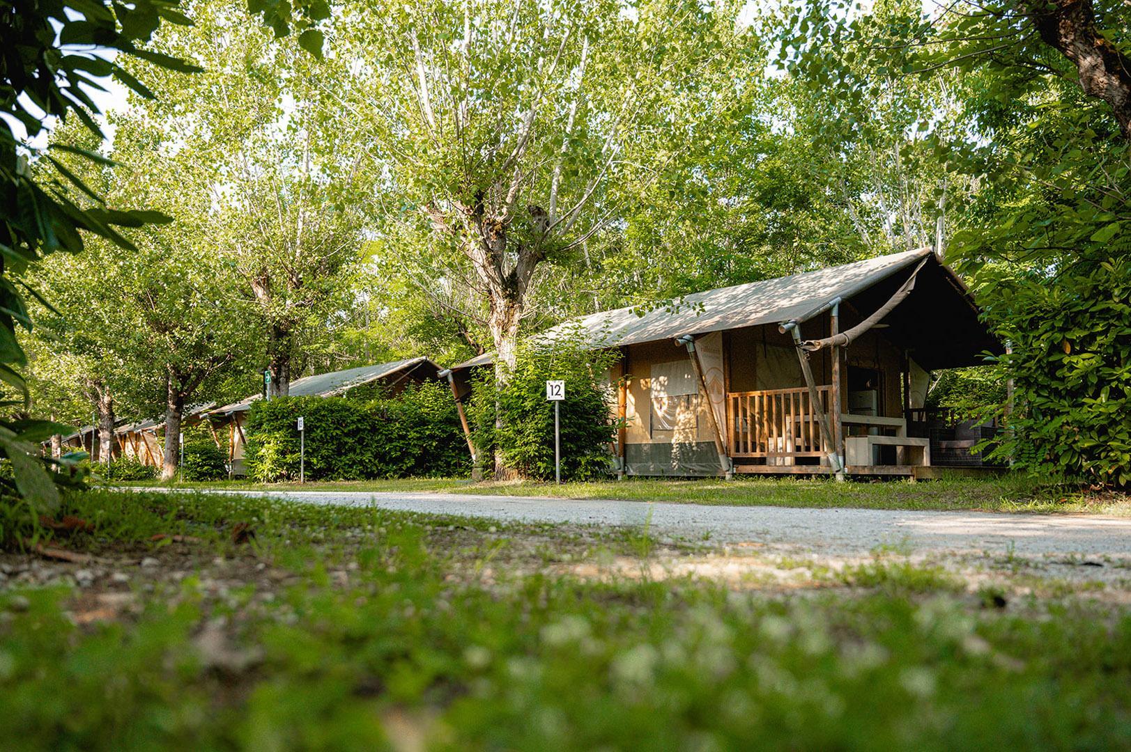 De Villatenten staan vooraan op de camping, dicht bij het zwembad en de receptie. Ze staan achter elkaar op mooie, ruime plaatsen zodat iedereen zijn eigen privacy heeft. De tenten op deze camping beschikken over een ventilator voor extra verkoeling tijdens de warme dagen.